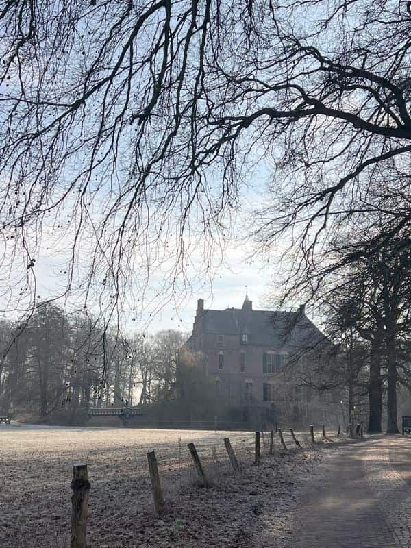 "Het heeft gevroren vannacht. Door de witte ijskristallen op het gras krijgt het kasteel een prachtige mysterieuze uitstraling. Ik blijf er naar kijken."