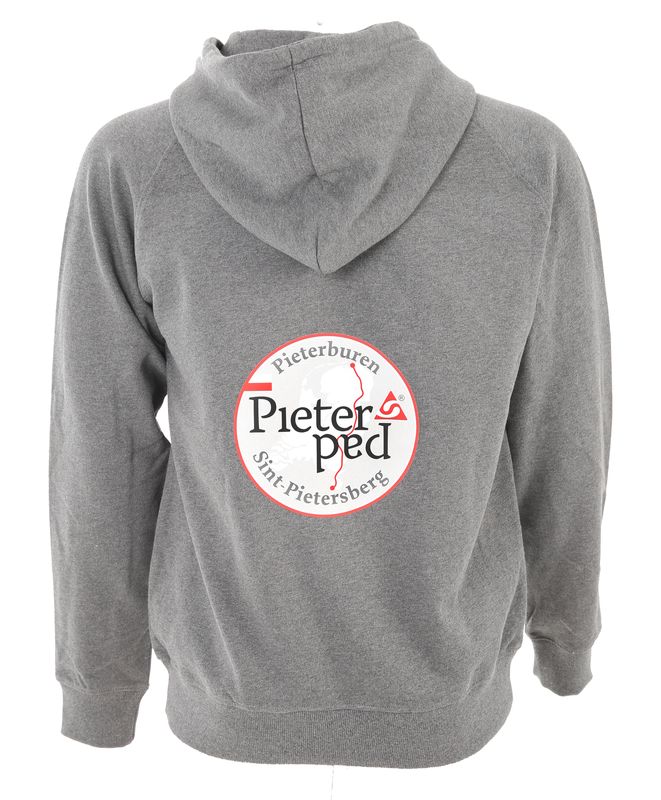 Hoge kwaliteit grijze sweater met capuchon en ritssluiting, Aan de voorkant is op de rechterborst het Pieterpad-logo aangebracht. Op de achterzijde het Pieterpad embleem met logo in de kaart van Nederland.