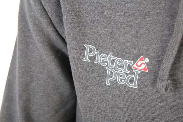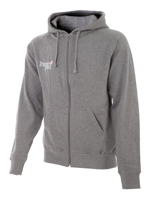 Hoge kwaliteit grijze sweater met capuchon en ritssluiting, Aan de voorkant is op de rechterborst het Pieterpad-logo aangebracht. Op de achterzijde het Pieterpad embleem met logo in de kaart van Nederland.